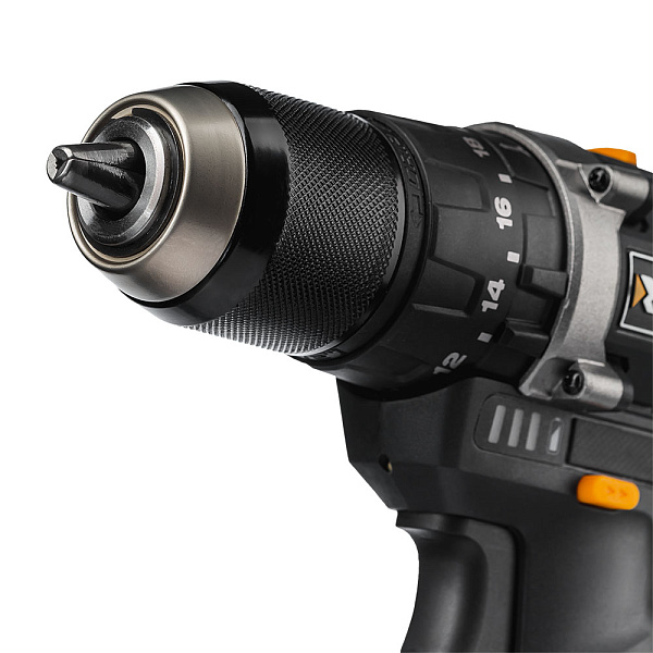 Эргономичный корпус и прорезиненная рукоять с 3D текстурой обеспечивает удобный хват и не позволит выскользнуть инструменту даже при работе в перчатках. Мы сделали дрель-шуруповерт максимально легкой и компактной: вес с батареей всего 1.1 кг. Это не только сделает продолжительную работу проще, но и позволит использовать его в труднодоступных местах. Корпус дрели усилен дополнительными ребрами жесткости для увеличения прочности. Инструмент оснащен быстрозажимным патроном: такой патрон не требует зажимания сверла с помощью дополнительного воротка, что существенно увеличивает темп работы. Кроме того, он исключает проворачивание сверла.