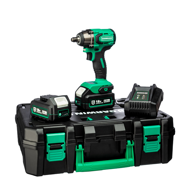 Аккумуляторный гайковёрт от GARWIN PRO поставляется в пластиковом кейсе в комплекте с двумя литий-ионными аккумуляторами ёмкостью 4 Ач и зарядным устройством.