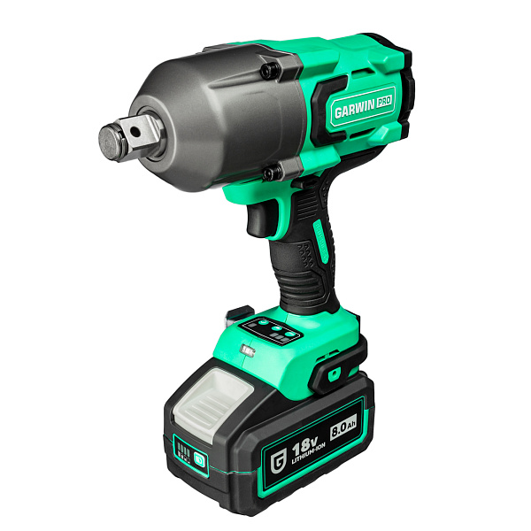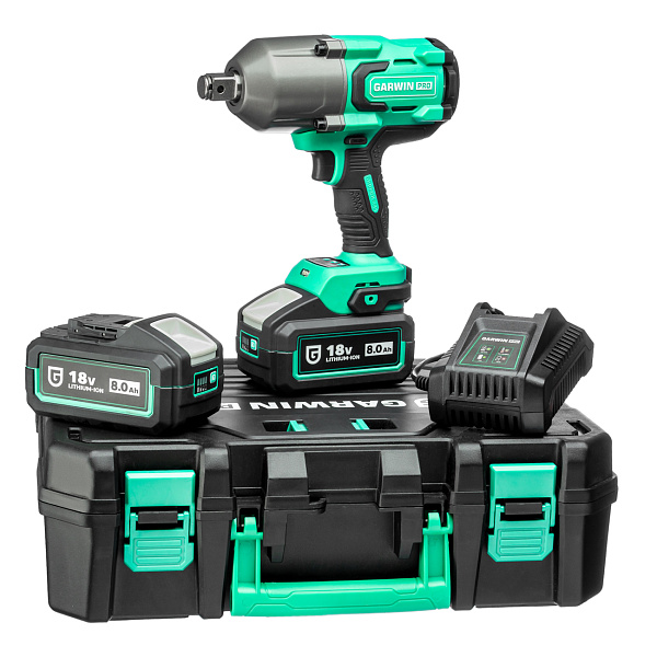 Аккумуляторный гайковёрт от GARWIN PRO поставляется в пластиковом кейсе в комплекте с двумя литий-ионными аккумуляторами ёмкостью 8 Ач и зарядным устройством.