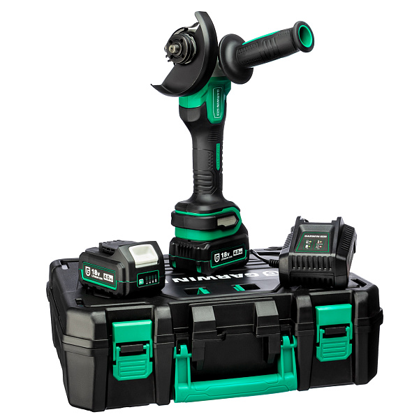 УШМ 125 мм от GARWIN PRO поставляется в пластиковом кейсе в комплекте с двумя литий-ионными аккумуляторами ёмкостью 4 Ач и зарядным устройством. Вес инструмента без аккумулятора - 1,7 кг.