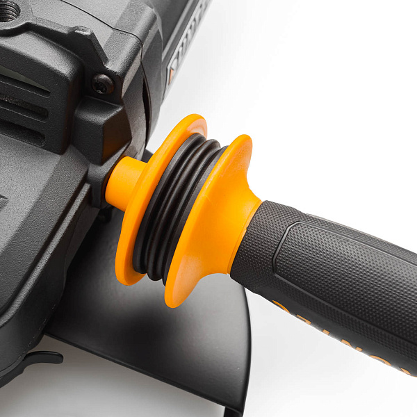 Основную рукоятку можно повернуть вокруг своей оси, что позволяет удобно держать инструмент при любом хвате. Эргономичный компактный корпус для использования даже в ограниченном пространстве. Защитный кожух диска не требует дополнительного инструмента для фиксации. УШМ оснащена широким удобным выключателем с пылезащитой и блокировкой непреднамеренного включения. Благодаря фиксации выключателя во включенном положении, не придется постоянно удерживать его во время продолжительной работы.