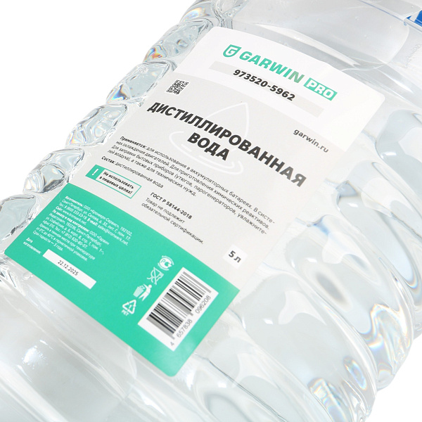 Дистиллированная вода GARWIN PRO 973520-5962 поставляется в канистрах объемом 5 литров. Это техническая очищенная вода, предназначенная для обслуживания автомобилей и промышленного оборудования.