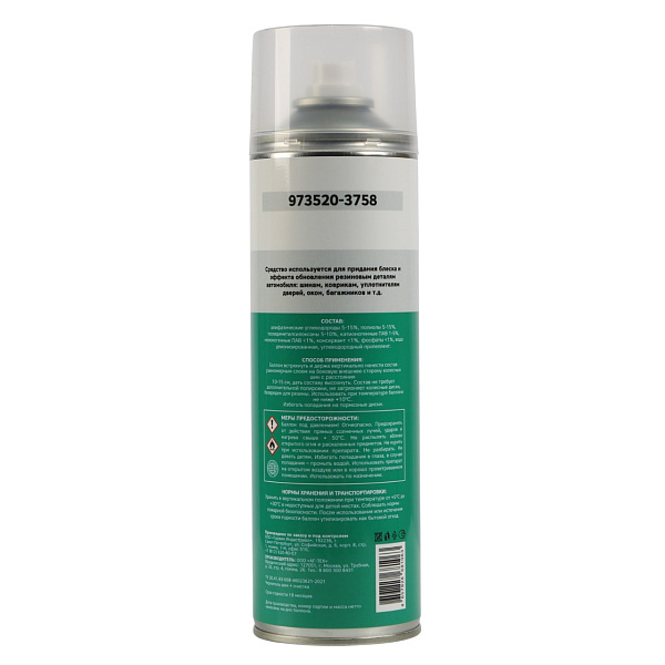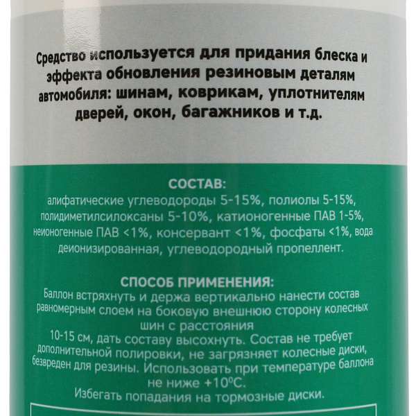 Содержит силиконы, препятствующие вредному воздействию окружающей среды и дорожных реагентов. Продлевает срок службы шлангов, уплотнителей дверей и других резиновых деталей, сохраняет их эластичность. Может использоваться для ухода за пластиковыми бамперами и решетками радиаторов, кожухами наружных зеркал, молдингами.
