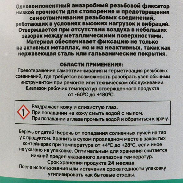 Этот фиксатор резьбы низкой прочности — оптимальный выбор для соединений, которые необходимо регулярно обслуживать. Обеспечивает надежную фиксацию при сохранении возможности легкого демонтажа без повреждения крепежных элементов.