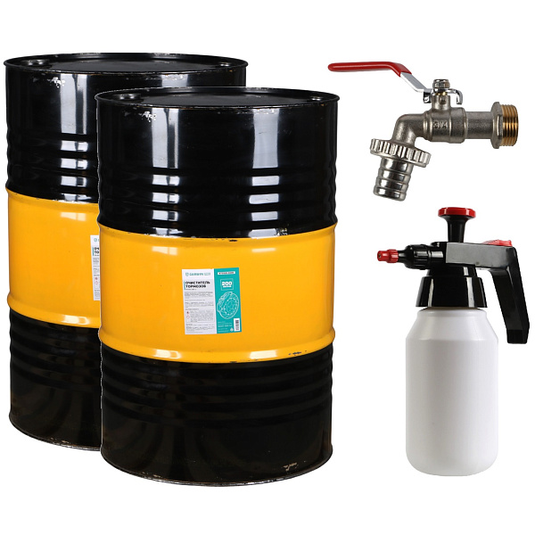 Удобство хранения и использования: В комплект входит кран для удобного забора жидкости из бочки и распылитель, что позволяет равномерно наносить средство на обрабатываемую поверхность.