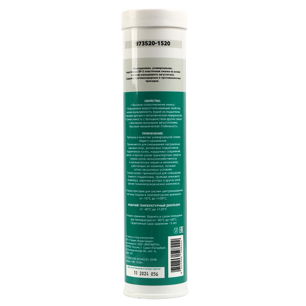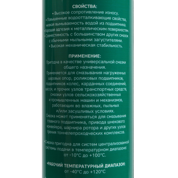 Содержит противозадирные и противоизносные присадки. Обладает хорошей адгезией к металлическим поверхностям и высокой механической стабильностью. Совместима с большинством других смазок с обычными мыльными загустителями. Температура применения -40С +120С. Температура каплепадения +120С. Нагрузка сваривания 2450Н (250 кгс). Вязкость базового масла 80. Прокачиваемость до +5С.