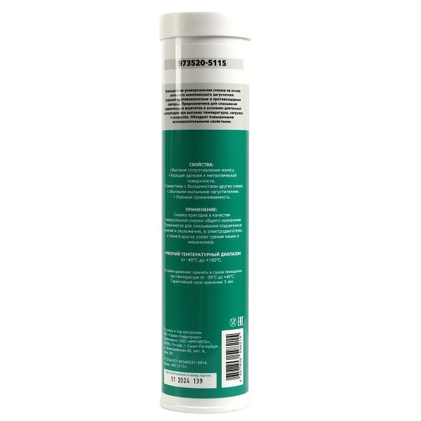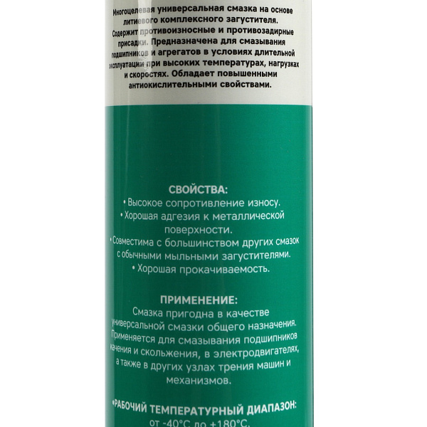 Пригодна в качестве универсальной смазки общего назначения для подшипников качения, скольжения, в электродвигателях и других узлах трения автомобиля и различных механизмов. Температура каплепадения 280С. Нагрузка сваривания 2932Н (299 кгс). Вязкость базового масла 180. Прокачиваемость до +5С.