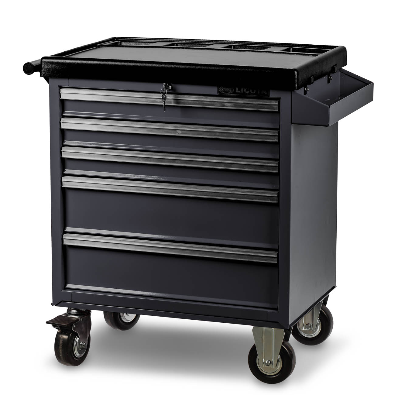 Система Easy lock предотвращает самопроизвольное открытие полок. Центральный замок предусмотрен для блокировки всех полок одновременно. Съёмный карман на корпусе тележки предназначен для хранения емкостей с техническими жидкостями.