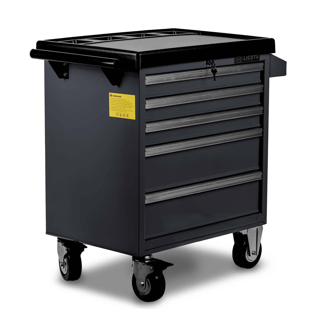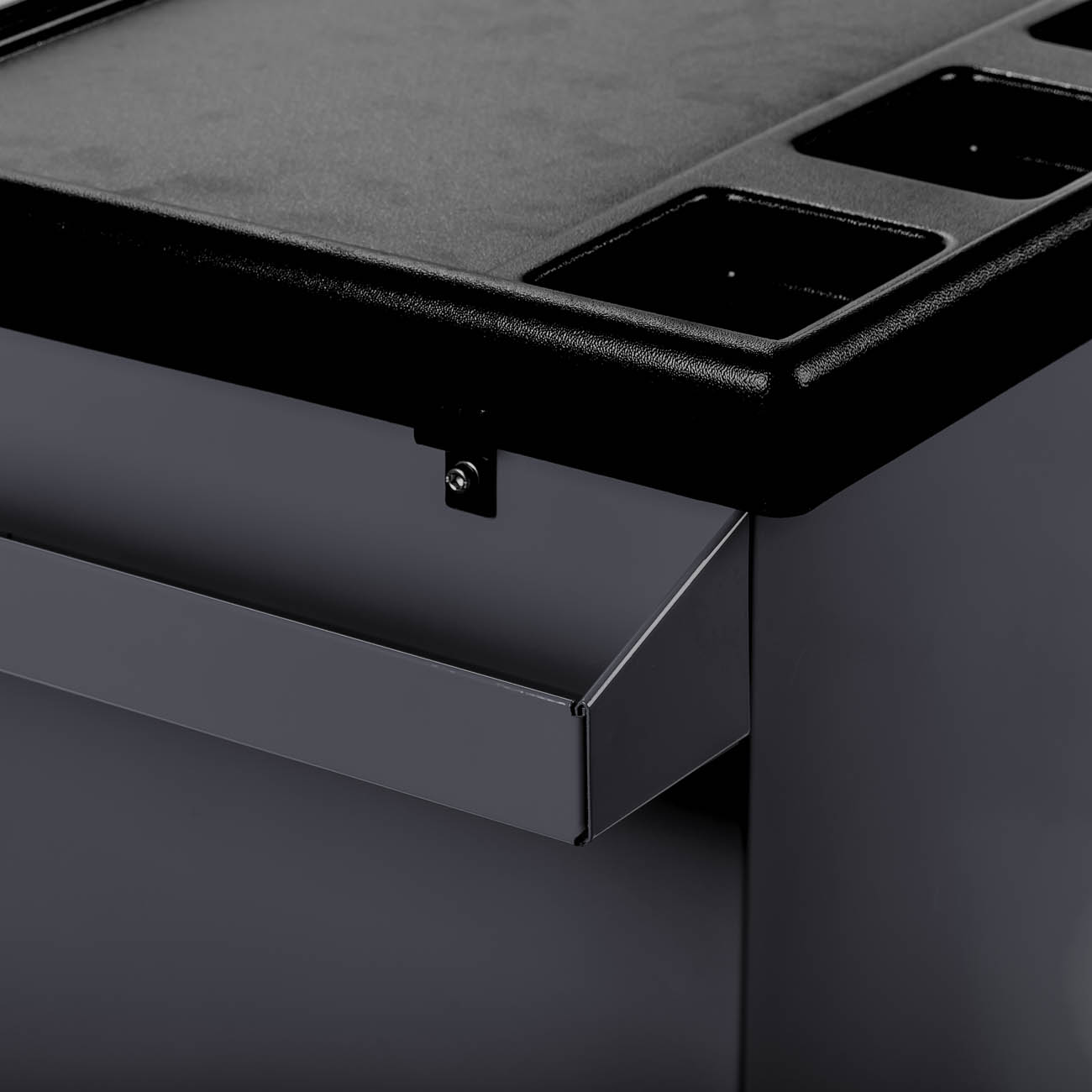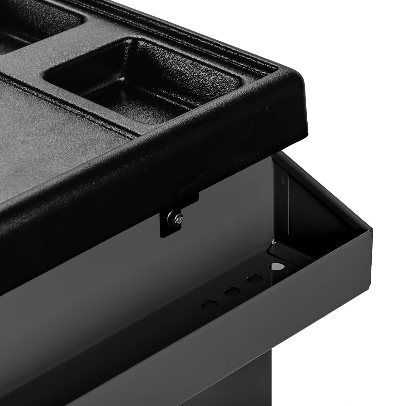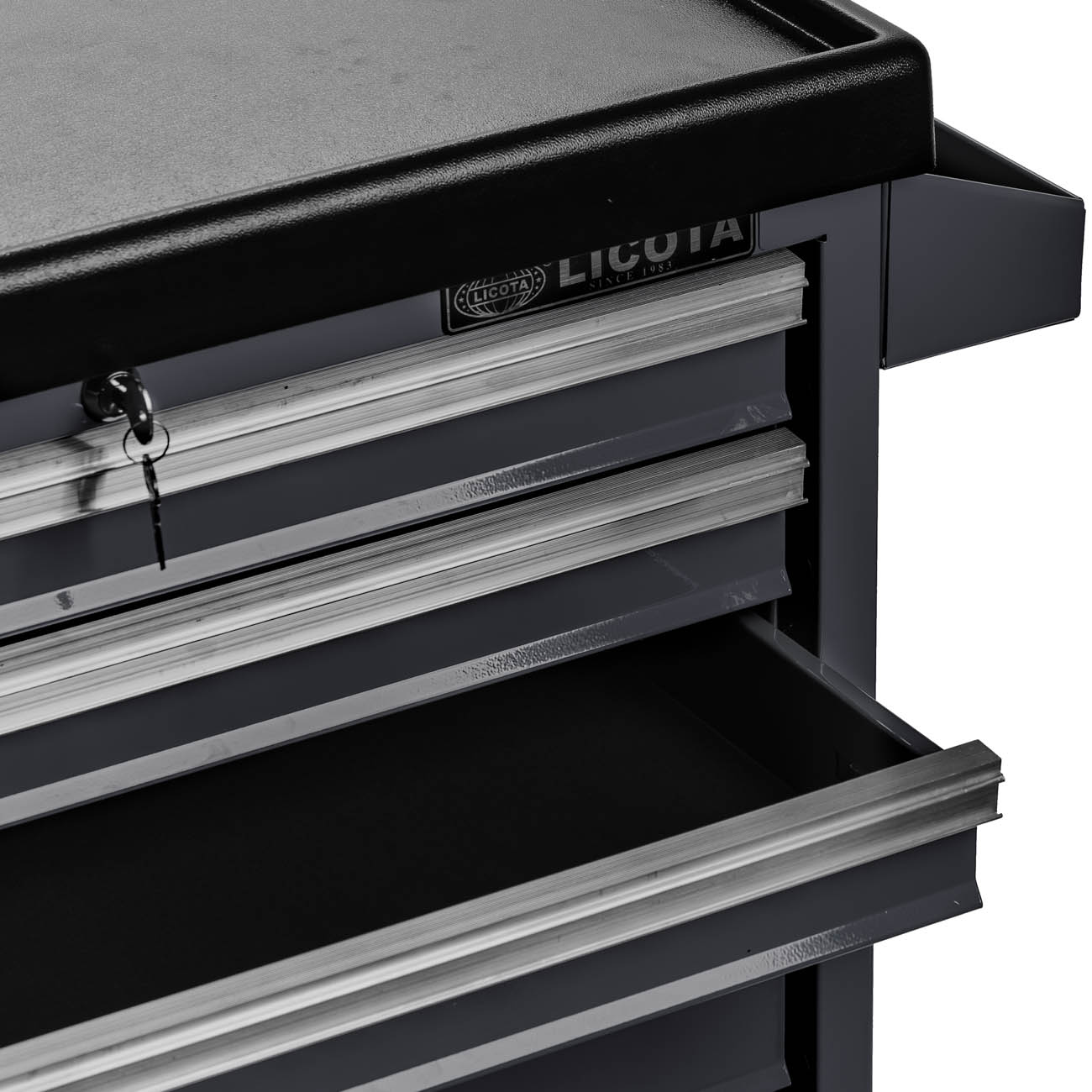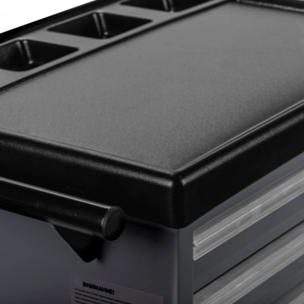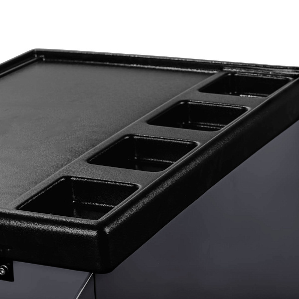 Система Easy lock предотвращает самопроизвольное открытие полок. Центральный замок предусмотрен для блокировки всех полок одновременно. Съёмный карман на корпусе тележки предназначен для хранения емкостей с техническими жидкостями.