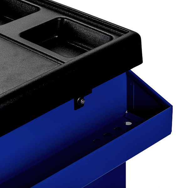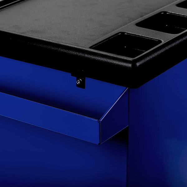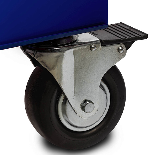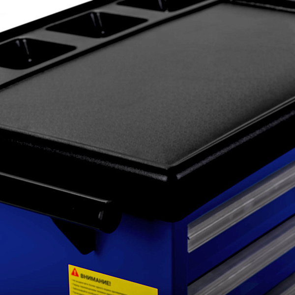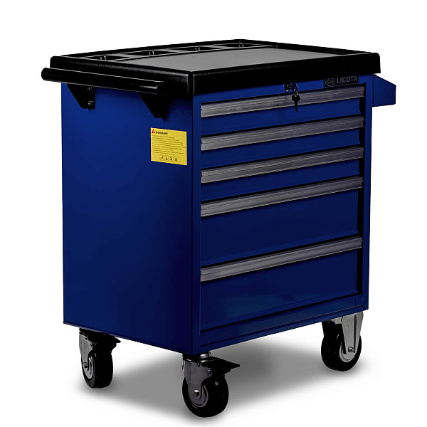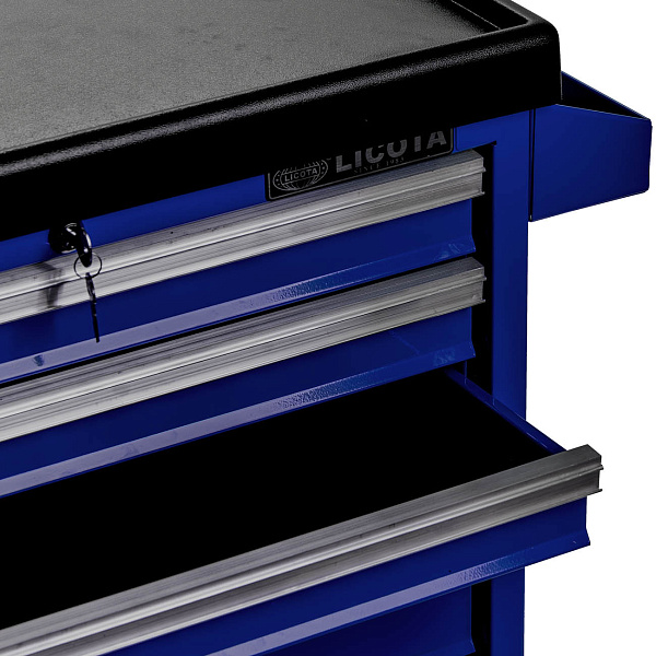 Система Easy lock предотвращает самопроизвольное открытие полок. Центральный замок предусмотрен для блокировки всех полок одновременно. Съёмный карман на корпусе тележки предназначен для хранения емкостей с техническими жидкостями.
