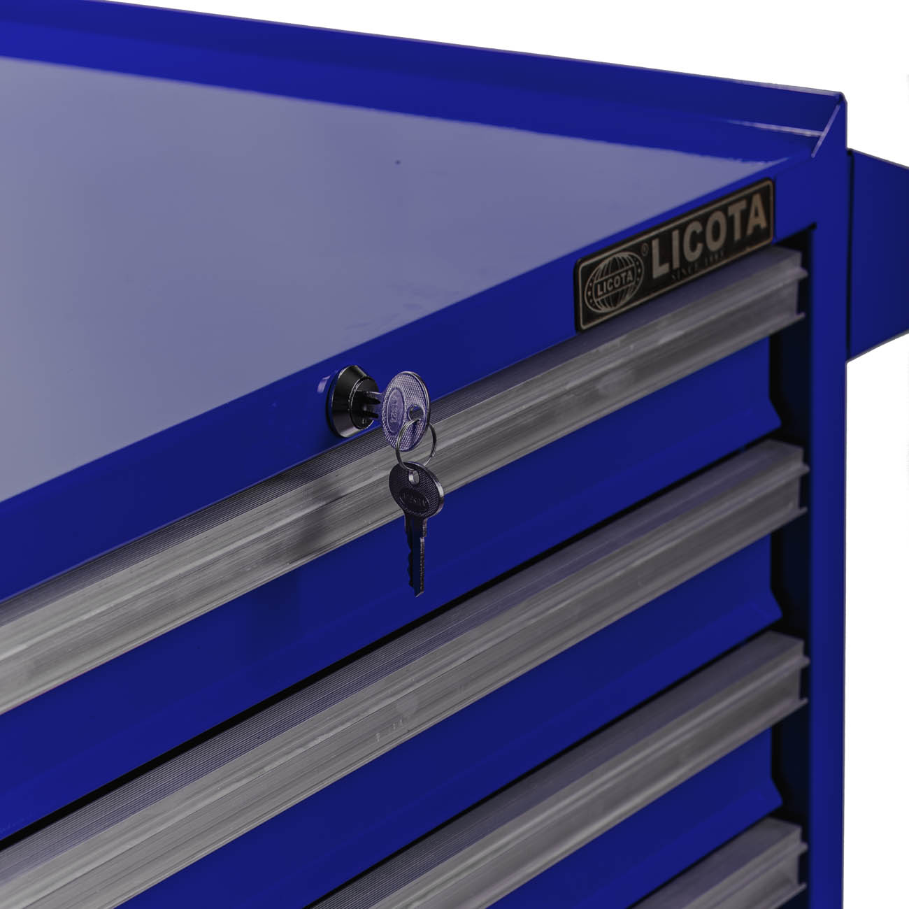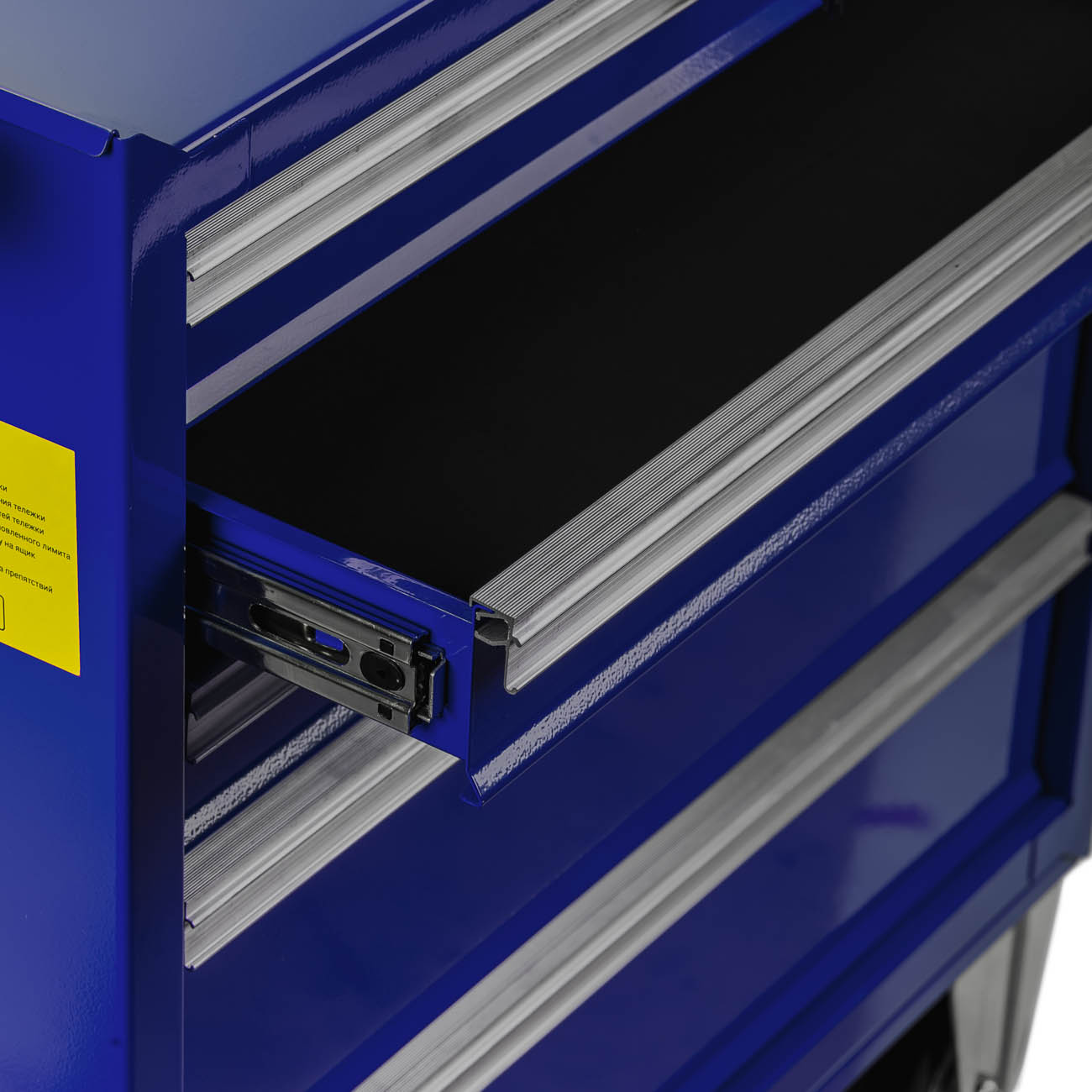 Система Easy lock предотвращает самопроизвольное открытие полок. Центральный замок предусмотрен для блокировки всех полок одновременно. Съёмный карман на корпусе тележки предназначен для хранения емкостей с техническими жидкостями.