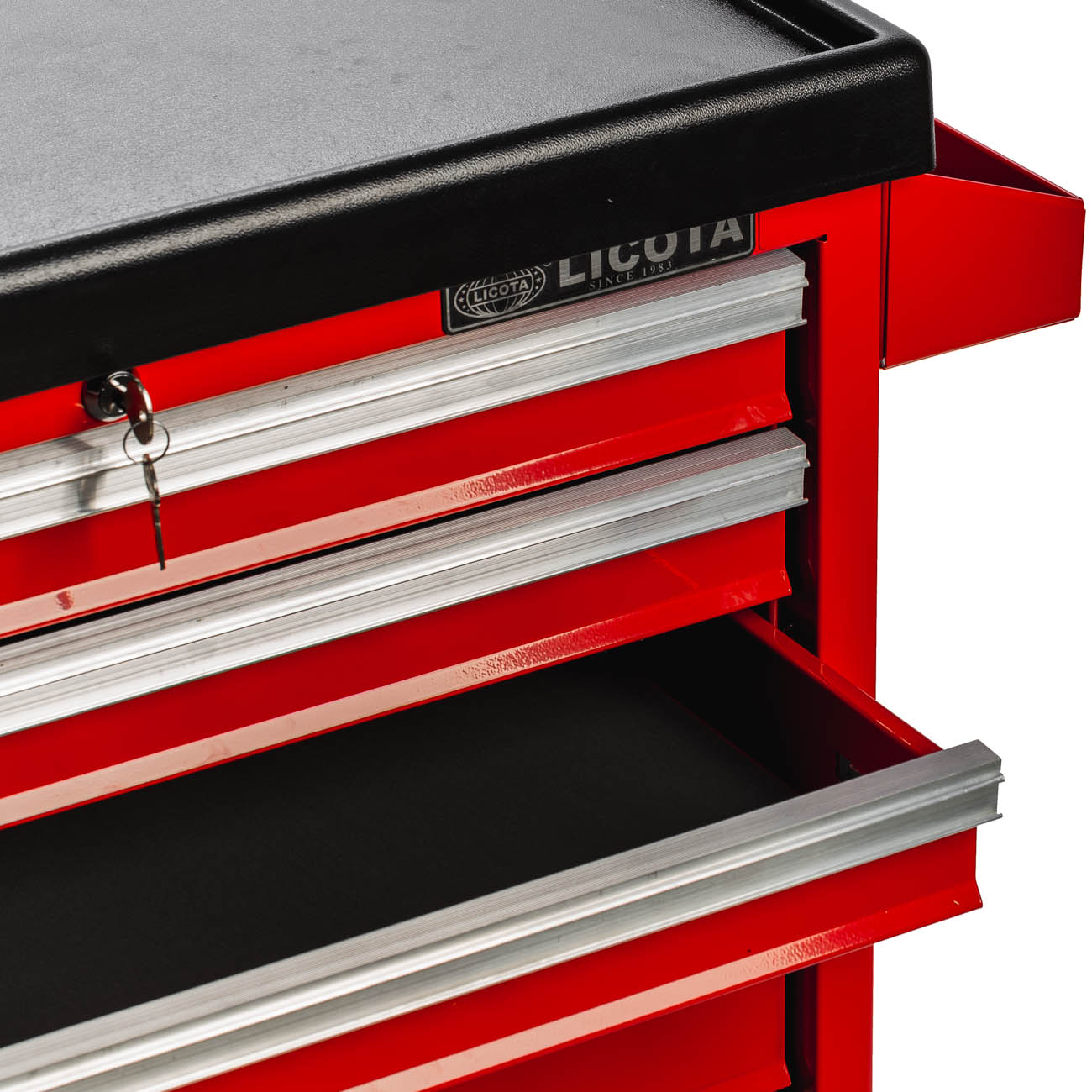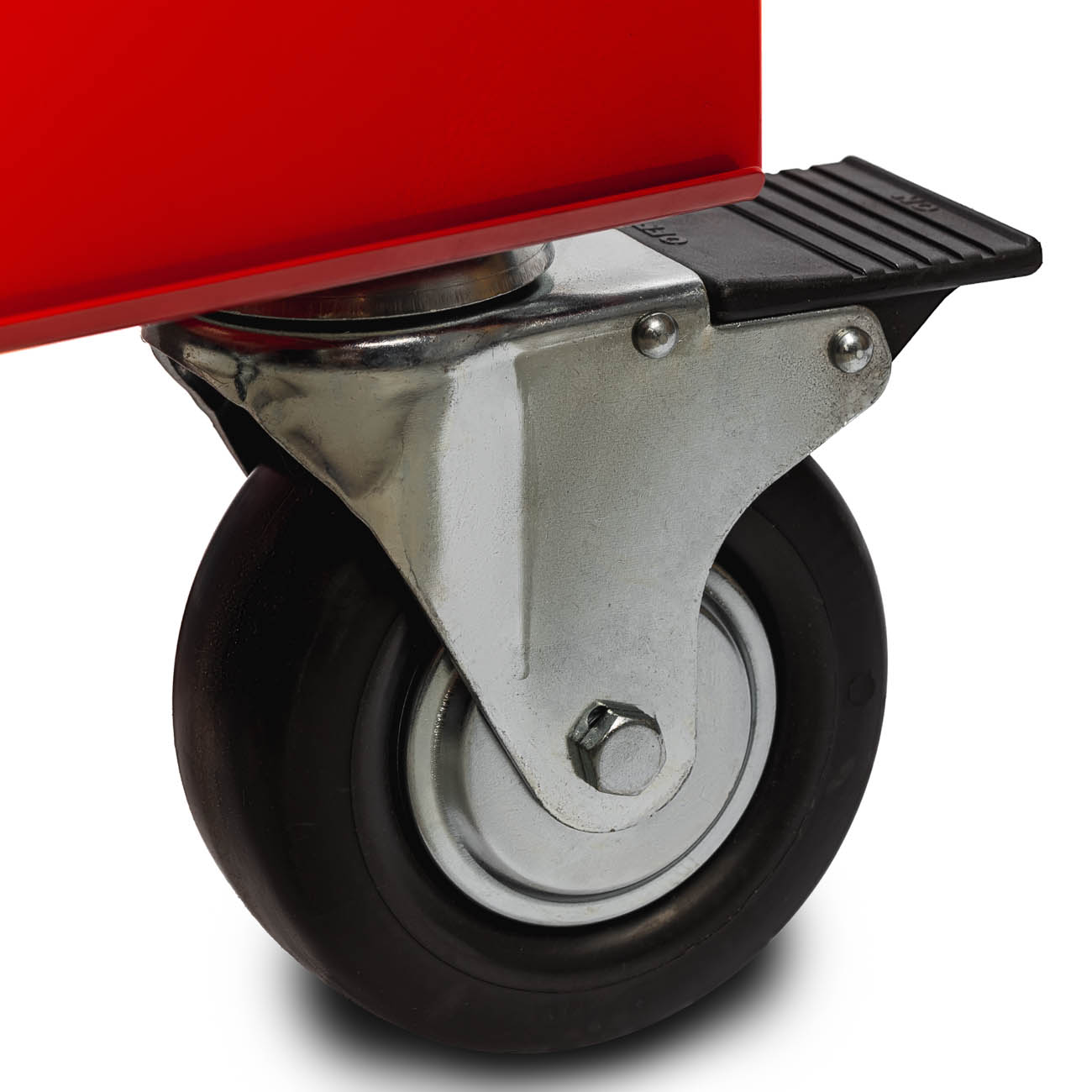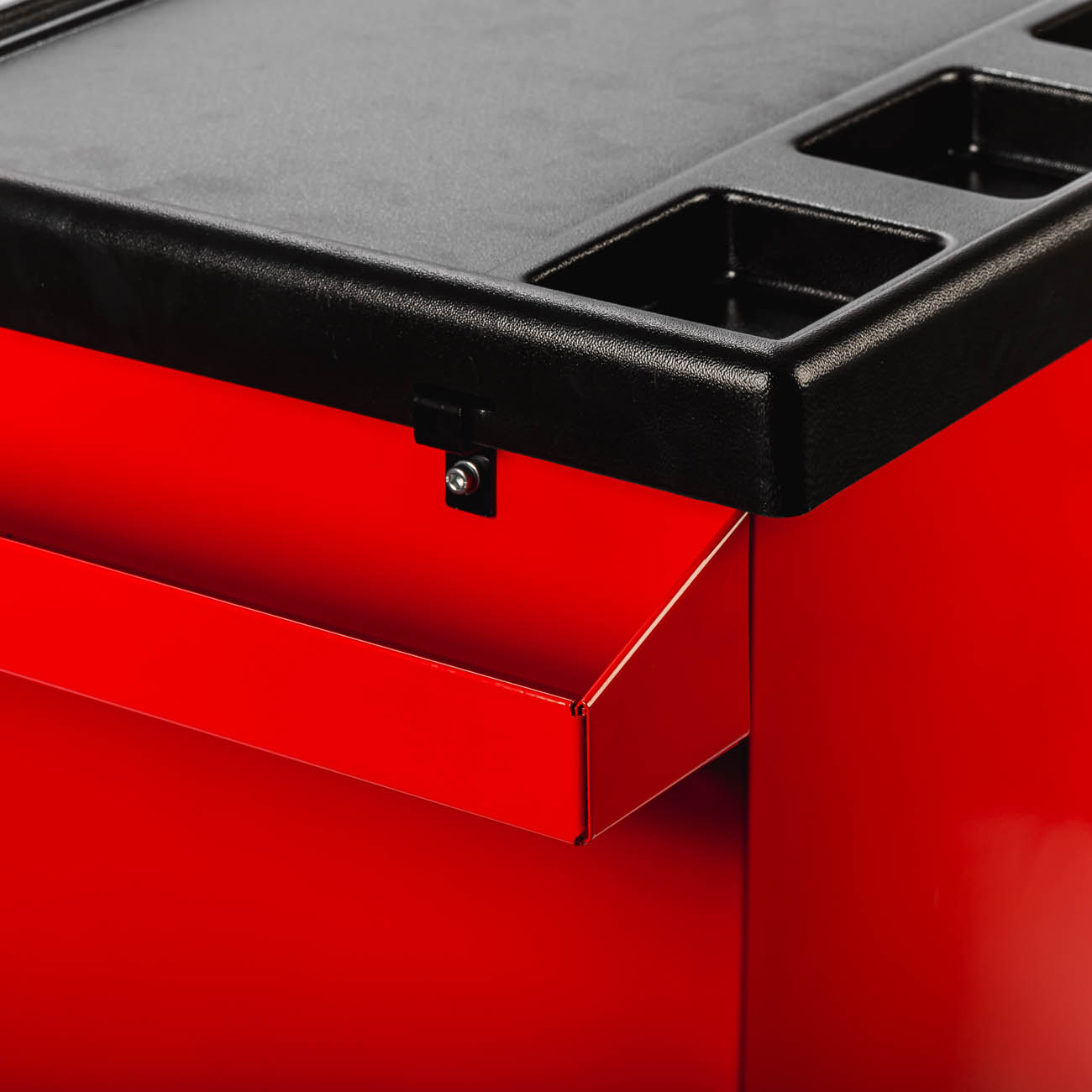 Система Easy lock предотвращает самопроизвольное открытие полок. Центральный замок предусмотрен для блокировки всех полок одновременно. Съёмный карман на корпусе тележки предназначен для хранения емкостей с техническими жидкостями.