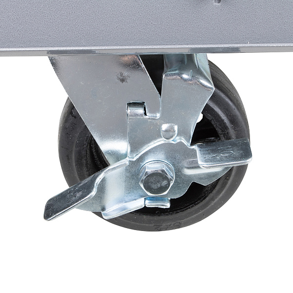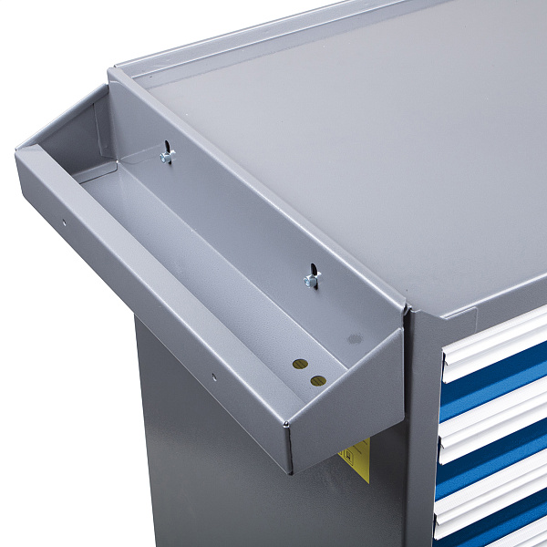 Тумба для инструментов на колесах изготовлена из цельного металлического листа толщиной 1,2 мм. Окрашена в серо-синий цвет порошковым покрытием, что обеспечивает защиту от механических повреждений и коррозии.