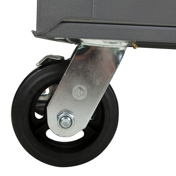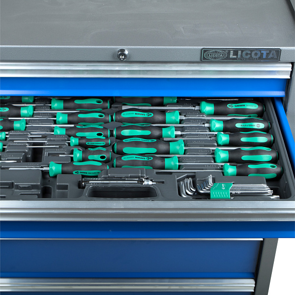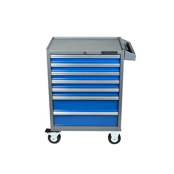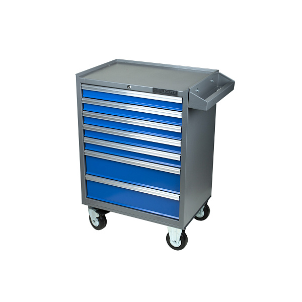 Тележка инструментальная Licota AWX-2603GB-N-R сине-серая с 7 ящиками предназначена для централизованного хранения и транспортировки инструментов в дилерских центрах, автомастерских и СТО. Благодаря колесам диаметром 125 мм легко перемещается в рабочей зоне. Система блокировки колес обеспечивает стабильность и безопасность во время использования.