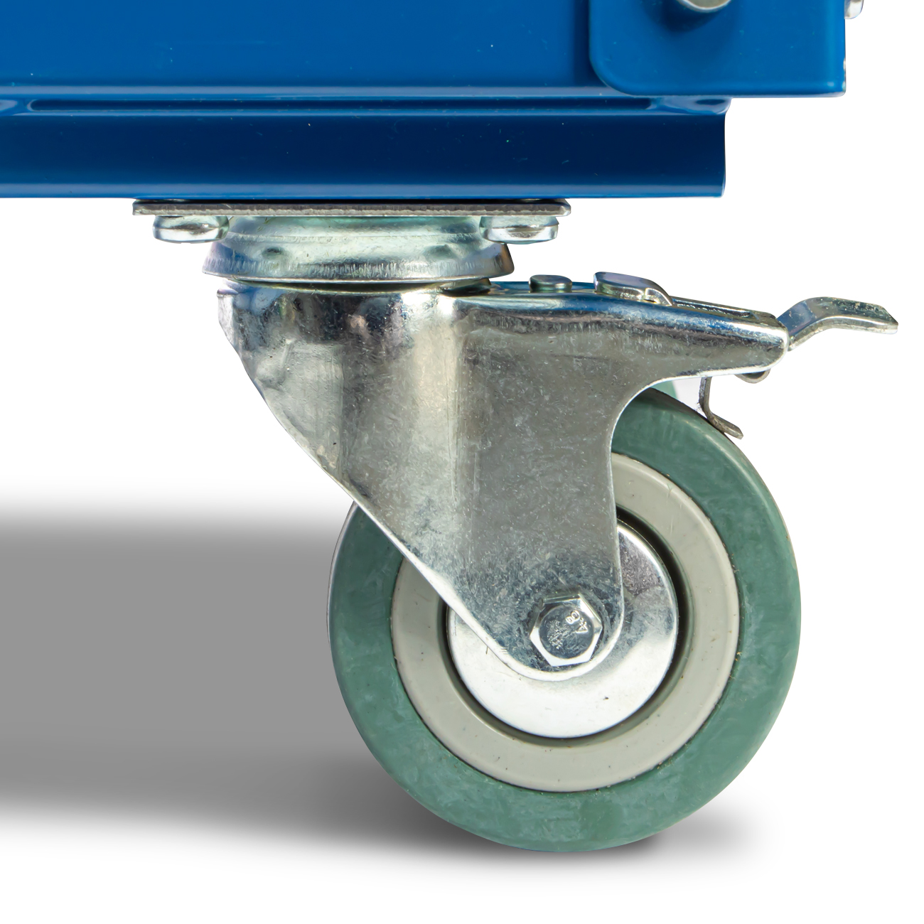 Телега инструментальная имеет крепкую рамную конструкцию, изготовлена из металла толщиной 1,2мм. Покрашена в синий цвет методом порошковой окраски, для защиты от коррозии и механических повреждений. Тележку легко перемещать по рабочей зоне благодаря малому весу и колесам диаметром 75 мм, устойчивым к воздействию масла и бензина. Система блокировки колес обеспечивает безопасную эксплуатацию.