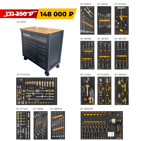| RT-PC1E12 | Набор ударно-рычажного инструмента RUNTEC в ложементе EVA, 12 предметов, 185x375x40 мм | |