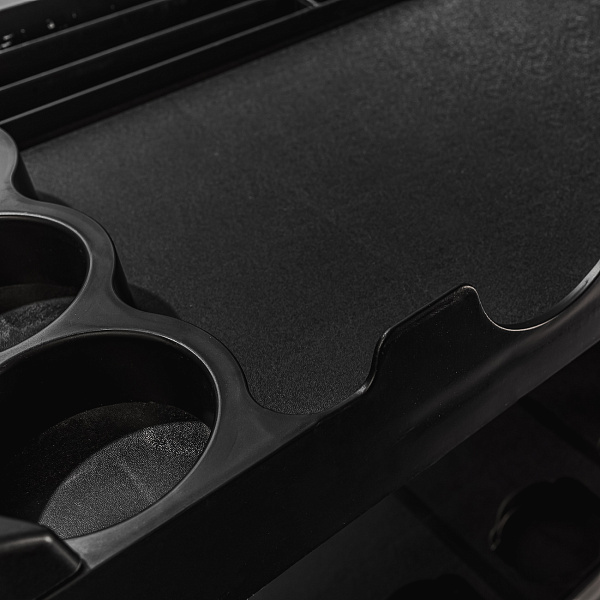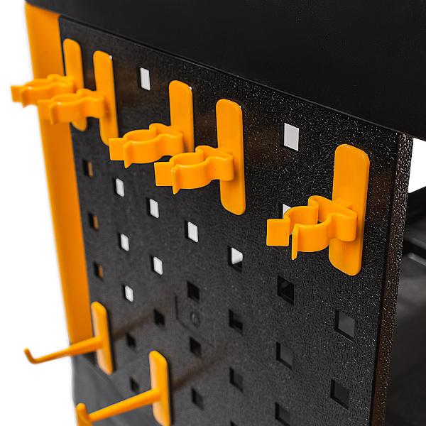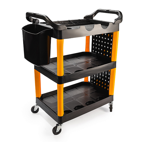 Легкая конструкция из полипропилена оснащена ребрами жесткости. Тележка устойчива к коррозии и механическим повреждениям. Маневренность и устойчивость за счет поворотных колес из резины. 2 рукоятки анатомической формы для удобства перемещения. Подвесной карман, крючки и зажимные держатели позволяют удобно организовать хранение. 12 углублений в полках для хранения мелких деталей и расходных материалов. Максимальная нагрузка на тележку — 200 кг.