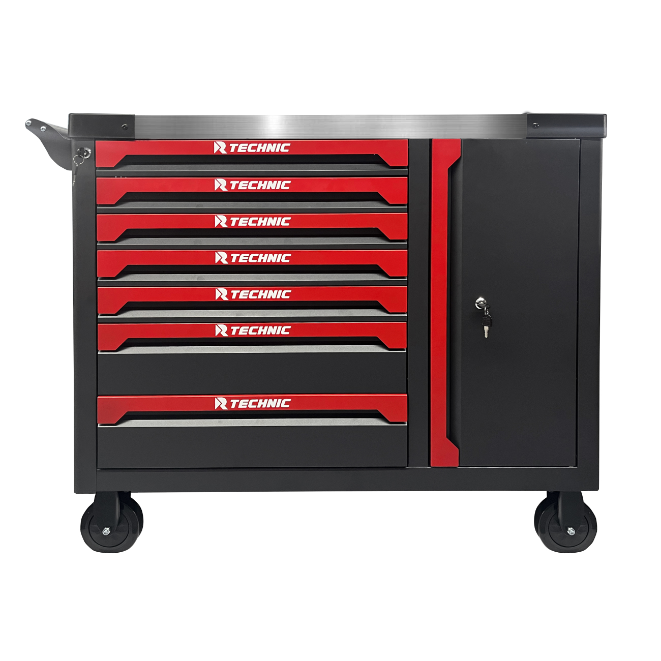 Верхняя часть выполнена в виде прочной столешницы с рабочей поверхностью из нержавеющей стали и нишами из ABS-пластика. Корпус изготовлен из холоднокатанной стали, что придаёт конструкции дополнительную жёсткость и долговечность. Боковые стенки имеют перфорацию с обеих сторон для крепления крючков и аксессуаров, позволяя удобно организовать рабочее пространство. Тележка установлена на увеличенные колёса из износостойкого полипропилена, что облегчает её перемещение даже при полной загрузке. В каждом ящике предусмотрены коврики из EVA-материала, защищающие инструмент от скольжения и повреждений.