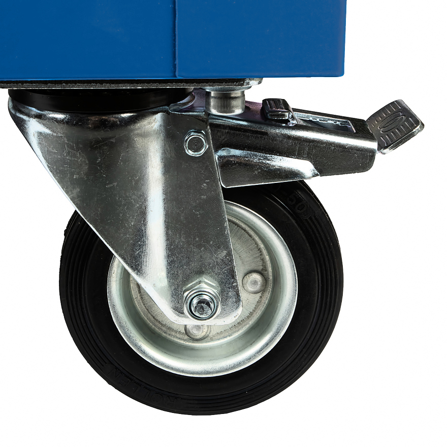 Выдвижные ящики разного размера для организации инструмента по категориям. Максимальная нагрузка — 350 кг, подходит для тяжёлого оборудования и оснастки. Функция блокировки колёс предотвращает самопроизвольное движение тележки при работе. Текстурные ручка тележки для удобного использования в перчатках. Центральный замок для защиты содержимого от несанкционированного доступа. Тележка выполнена из сварной рамы и листового каркаса из металла толщиной 1.2 мм, что гарантирует прочность конструкции и долговечность в условиях интенсивной эксплуатации.