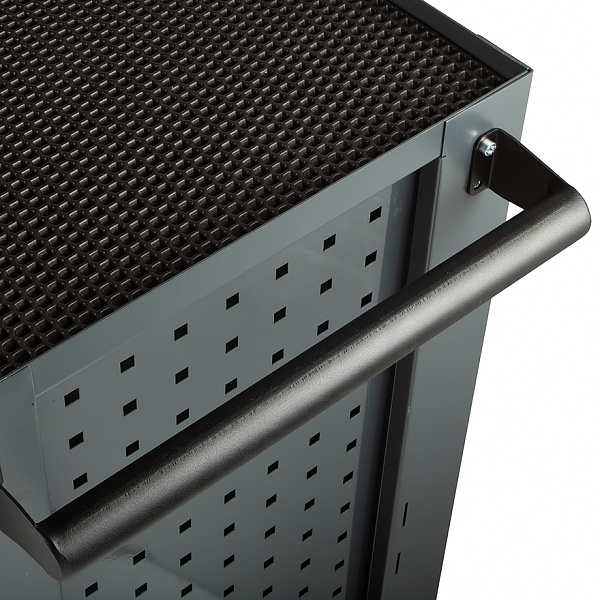 Выдвижные ящики разного размера для организации инструмента по категориям. Максимальная нагрузка — 350 кг, подходит для тяжёлого оборудования и оснастки. Функция блокировки колёс предотвращает самопроизвольное движение тележки при работе. Текстурные ручка тележки для удобного использования в перчатках. Центральный замок для защиты содержимого от несанкционированного доступа. Тележка выполнена из сварной рамы и листового каркаса из металла толщиной 1.2 мм, что гарантирует прочность конструкции и долговечность в условиях интенсивной эксплуатации.