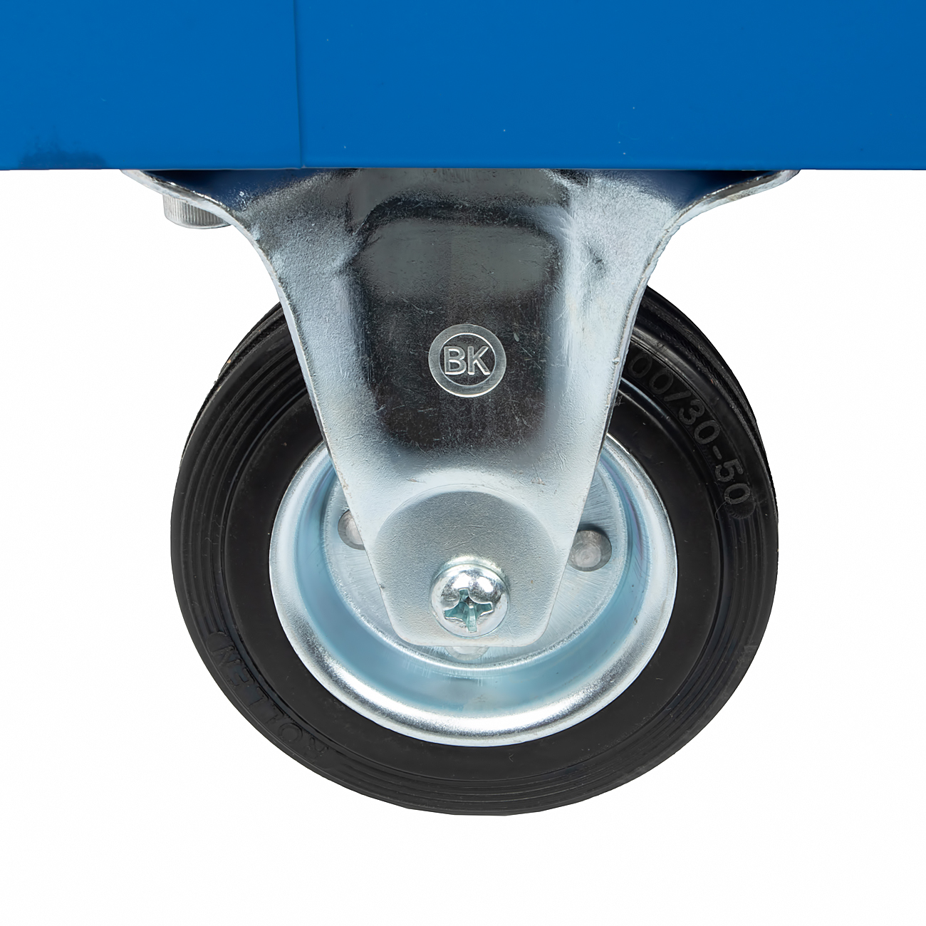 Выдвижные ящики разного размера для организации инструмента по категориям. Максимальная нагрузка — 350 кг, подходит для тяжёлого оборудования и оснастки. Функция блокировки колёс предотвращает самопроизвольное движение тележки при работе. Текстурные ручка тележки для удобного использования в перчатках. Центральный замок для защиты содержимого от несанкционированного доступа. Тележка выполнена из сварной рамы и листового каркаса из металла толщиной 1.2 мм, что гарантирует прочность конструкции и долговечность в условиях интенсивной эксплуатации.