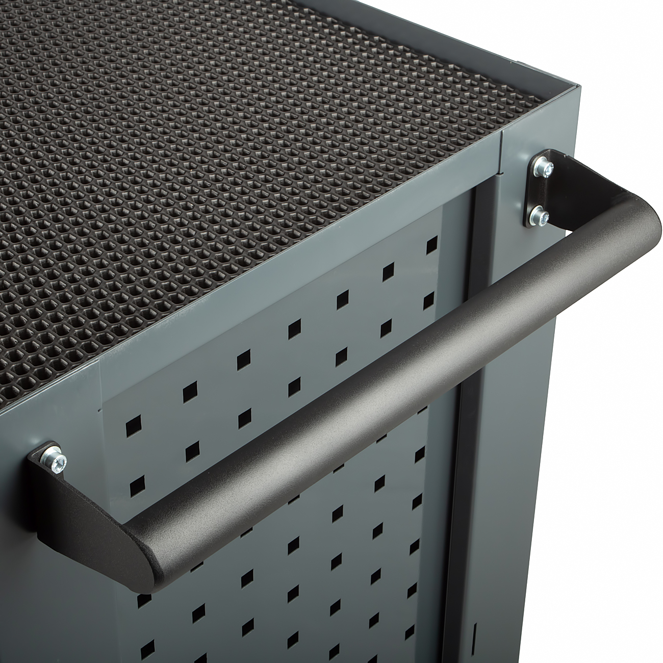 Выдвижные ящики разного размера для организации инструмента по категориям. Максимальная нагрузка — 350 кг, подходит для тяжёлого оборудования и оснастки. Функция блокировки колёс предотвращает самопроизвольное движение тележки при работе. Текстурные ручка тележки для удобного использования в перчатках. Центральный замок для защиты содержимого от несанкционированного доступа. Тележка выполнена из сварной рамы и листового каркаса из металла толщиной 1.2 мм, что гарантирует прочность конструкции и долговечность в условиях интенсивной эксплуатации.