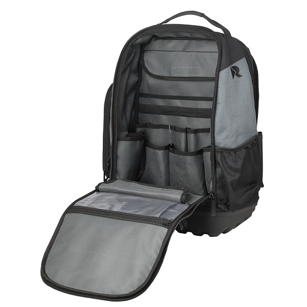 Конструкция рюкзака предусматривает 31 карман и петли для размещения инструментов, включая открытые, закрытые и потайные отделения. Для удобства переноски предусмотрены двойные верхние ручки, а также дышащие мягкие плечевые ремни, снижающие нагрузку при длительном использовании. Жёсткое дно обеспечивает устойчивость рюкзака и защищает содержимое от грязи и влаги.