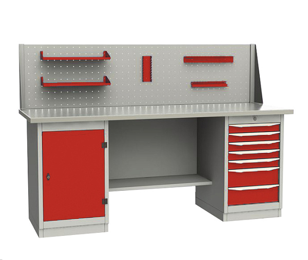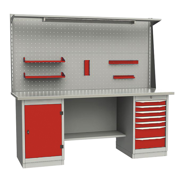 Экраны 500 или 1000 мм с держателями экрана. Светильники, навесные полки, карманы и крюки для инструментов, деталей и оснастки. Дополнительный лист стали 4 мм для столешницы. Все это позволит получить максимально удобное рабочее пространство.