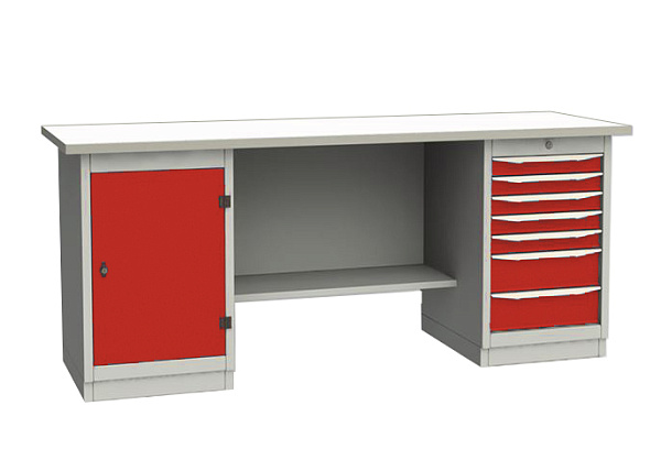 Верстак двухтумбовый с дверцей и 7 ящиками с оцинкованной столешницей 2000 мм (красный RAL3000)