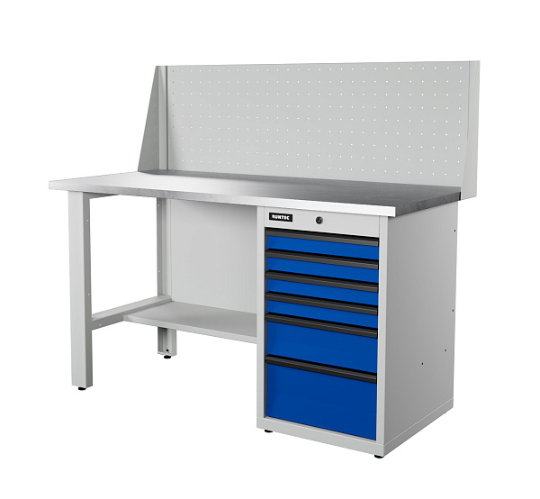 Верстак серии Industrial из конструкционной стали. Встроенные замки с системой Easy Lock позволяют закрыть все ящики одним поворотом ключа. Верстак рассчитан на распределенную нагрузку до 1500 кг.