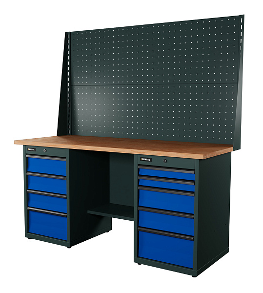 Верстак серии Industrial из конструкционной стали. Встроенные замки с системой Easy Lock позволяют закрыть все ящики одним поворотом ключа. Верстак рассчитан на распределенную нагрузку до 1500 кг.