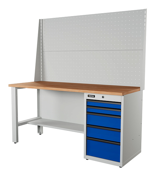 Верстак серии Industrial, 1700 мм, фанера, тумба с 5-ю ящиками, экран 1000, синий (светло-серый) RAL 5005 (7035)