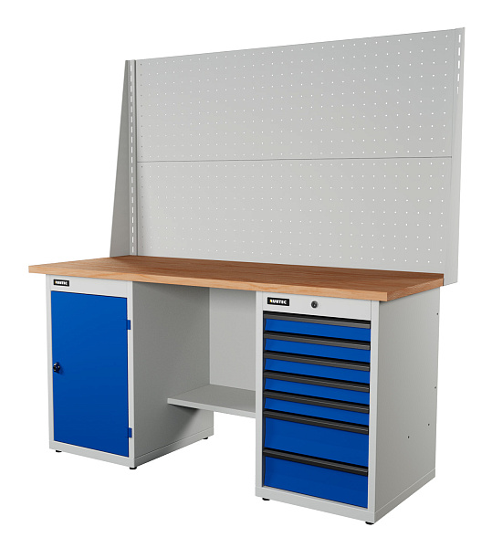 Распределенная нагрузка на верстак достигает 1500 кг благодаря использованию конструкционной стали толщиной от 1 до 2 мм при производстве сборочных составляющих. Эпоксидное порошковое покрытие устойчиво к механическим и химическим воздействиям.