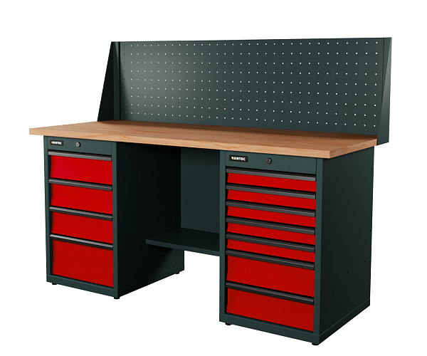 Верстак серии Industrial из конструкционной стали. Встроенные замки с системой Easy Lock позволяют закрыть все ящики одним поворотом ключа. Верстак рассчитан на распределенную нагрузку до 1500 кг.