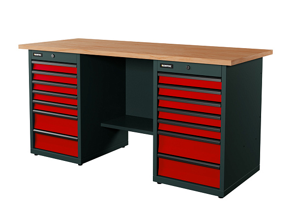 Верстак серии Industrial, 1700 мм, фанера, тумба с 7-ю ящиками + тумба с 7-ю ящиками, красный RAL 3020