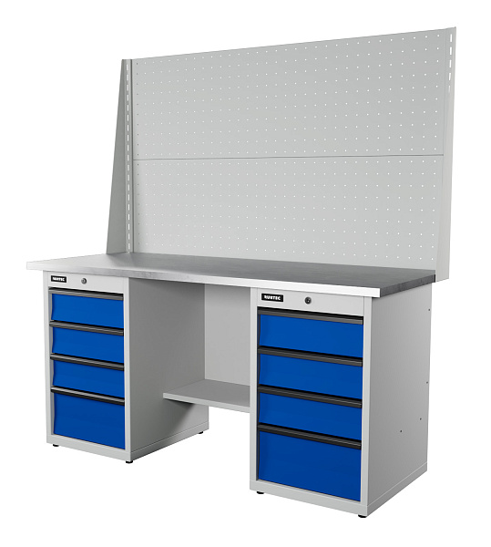 Верстак серии Industrial, 1700 мм, оцинк, тумба с 4-мя ящиками + тумба с 4-мя ящиками, экран 1000, синий (светло-серый), RUNTEC, RTI17Z-TI4-TI4-P17-P17-5005(7035)