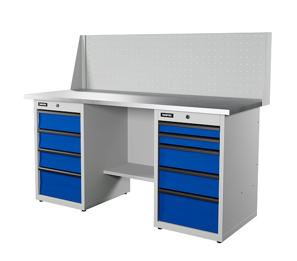 Верстак серии Industrial, 1700 мм, оцинк, тумба с 4-мя ящиками + тумба с 5-ю ящиками, экран 500, синий (светло-серый) RA