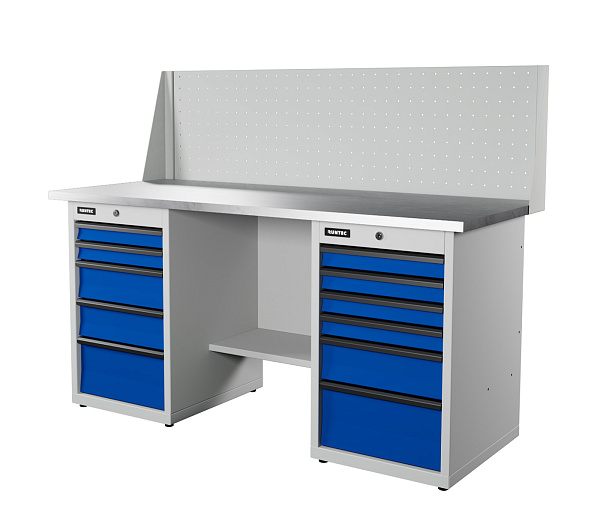 Верстак серии Industrial, 1700 мм, оцинк, тумба с 5-ю ящиками + тумба с 6-ю ящиками, экран 500, синий (светло-серый) RAL