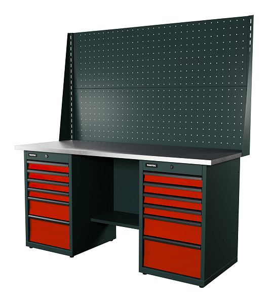 Верстак серии Industrial из конструкционной стали. Встроенные замки с системой Easy Lock позволяют закрыть все ящики одним поворотом ключа. Верстак рассчитан на распределенную нагрузку до 1500 кг.