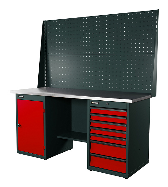 Верстак серии Industrial, 1700 мм, оцинк, тумба с 7-ю ящиками + тумба с дверью, экран 1000, красный RAL 3020