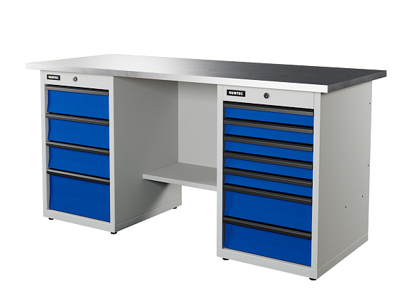 Верстак серии Industrial из конструкционной стали. Встроенные замки с системой Easy Lock позволяют закрыть все ящики одним поворотом ключа. Верстак рассчитан на распределенную нагрузку до 1500 кг.