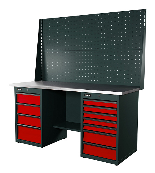 Верстак серии Industrial, 1700 мм, оцинк, тумба с 7-ю ящиками + тумба с 4-мя ящиками, экран 1000, красный RAL 3020