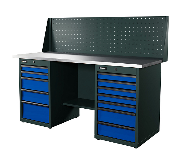 Верстак серии Industrial из конструкционной стали. Встроенные замки с системой Easy Lock позволяют закрыть все ящики одним поворотом ключа. Верстак рассчитан на распределенную нагрузку до 1500 кг.