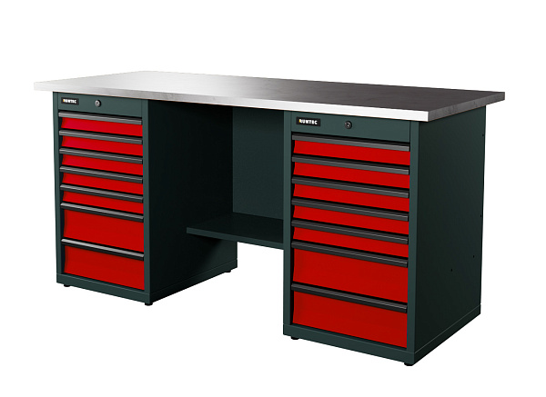 Верстак серии Industrial, 1700 мм, оцинк, тумба с 7-ю ящиками + тумба с 7-ю ящиками, красный RAL 3020, RUNTEC, RTI17Z-TI7-TI7-3020
