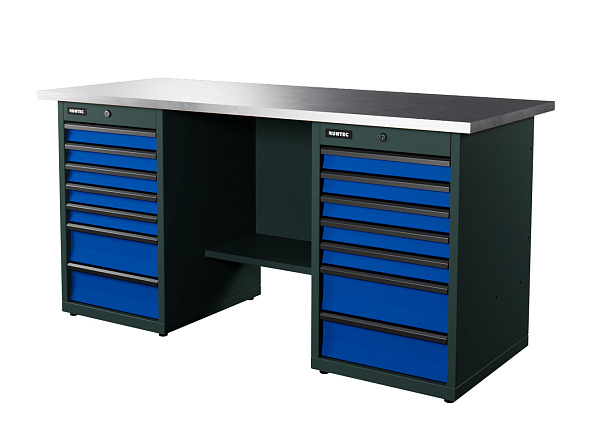 Верстак серии Industrial, 1700 мм, оцинк, тумба с 7-ю ящиками + тумба с 7-ю ящиками, синий RAL 5005