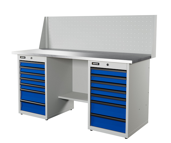 Верстак серии Industrial, 1700 мм, оцинк, тумба с 7-ю ящиками + тумба с 7-ю ящиками, экран 500, синий (светло-серый) RAL