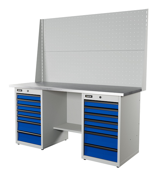 Верстак серии Industrial, 1700 мм, оцинк, тумба с 7-ю ящиками + тумба с 7-ю ящиками, экран 1000, синий (светло-серый) RA, RUNTEC, RTI17Z-TI7-TI7-P17-P17-5005(7035)