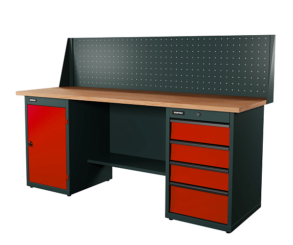 Верстак серии Industrial, 2000 мм, фанера, тумба с дверью + тумба с 4-мя ящиками, экран 500, красный RAL 3020, RUNTEC, RTI20F-TI0-TI4-P20-3020