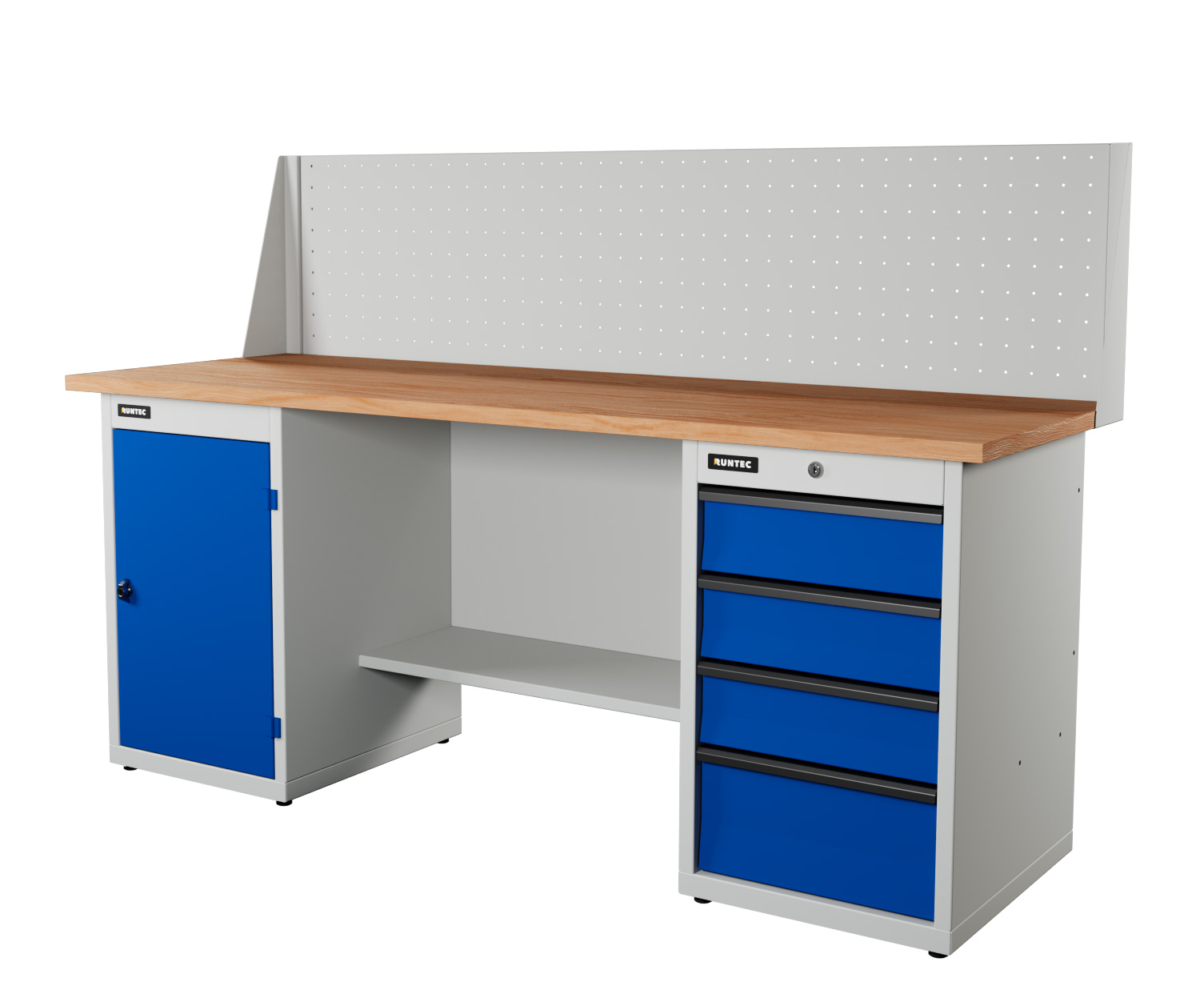 Верстак серии Industrial, 2000 мм, фанера, тумба с дверью + тумба с 4-мя ящиками, экран 500, синий (светло-серый) RAL 50