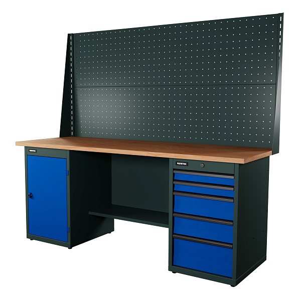 Верстак серии Industrial, 2000 мм, фанера, тумба с дверью + тумба с 5-ю ящиками, экран 1000, синий RAL 5005, RUNTEC, RTI20F-TI0-TI5-P20-P20-5005